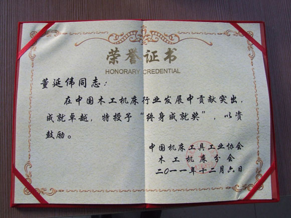 在中國機床工具工業協會木工機床分會的表彰大會上,公司被授予木工機床行業十一五“自主創新十佳企業”稱號,公司董事長董延偉獲得中國木工機床行業“終身成就獎”。