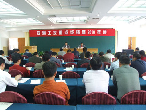 本報訊   10月28日,“亞洲工友2010年重點經銷商大會”在廈門白鷺賓館召開,會議的主題是“開拓創新、轉變思路、調整營銷策略、打造更加強壯的產銷鏈 ”。董事長董延偉到會并做了重要講話,公司總經理羅壽平主持會議。副總經理李忠剛、宋志敏、劉新輝以及技術研發、生產、銷售等部門相關人員以及來自全國各地120多家經銷商參加了會議。